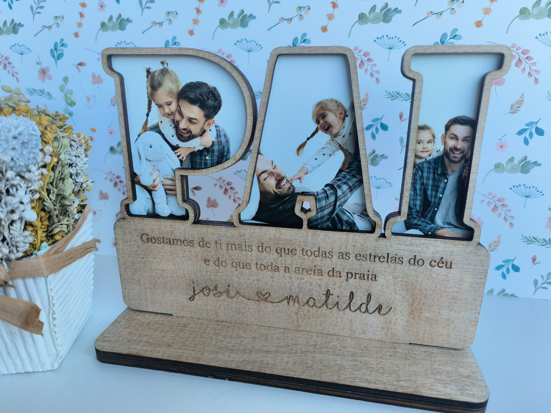 Uma moldura diferente em madeira e com uma frase gravada a laser. No centro, a palavra 'Pai' destaca-se com fotos ternurentas, que captam o amor e a cumplicidade entre um pai e um filho.